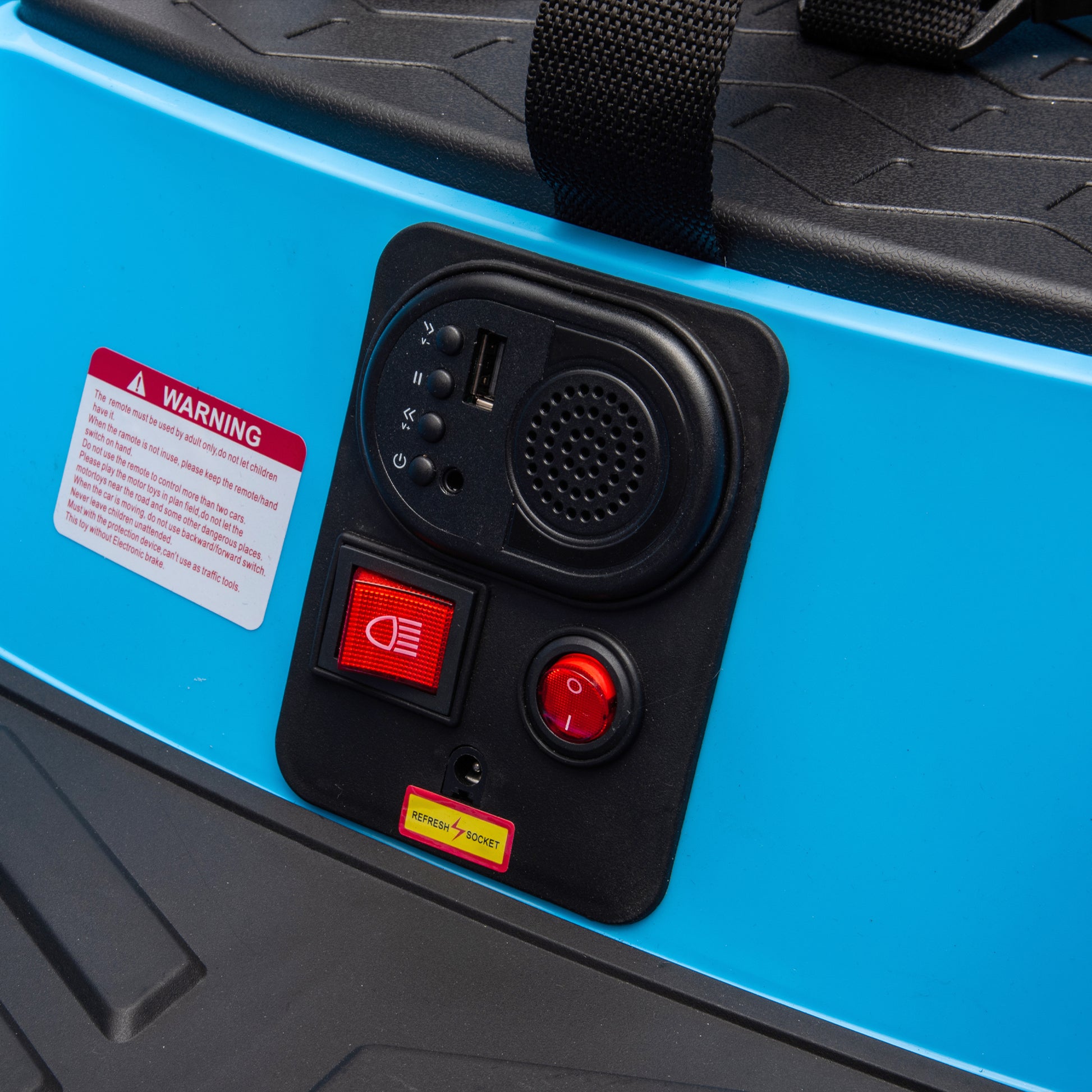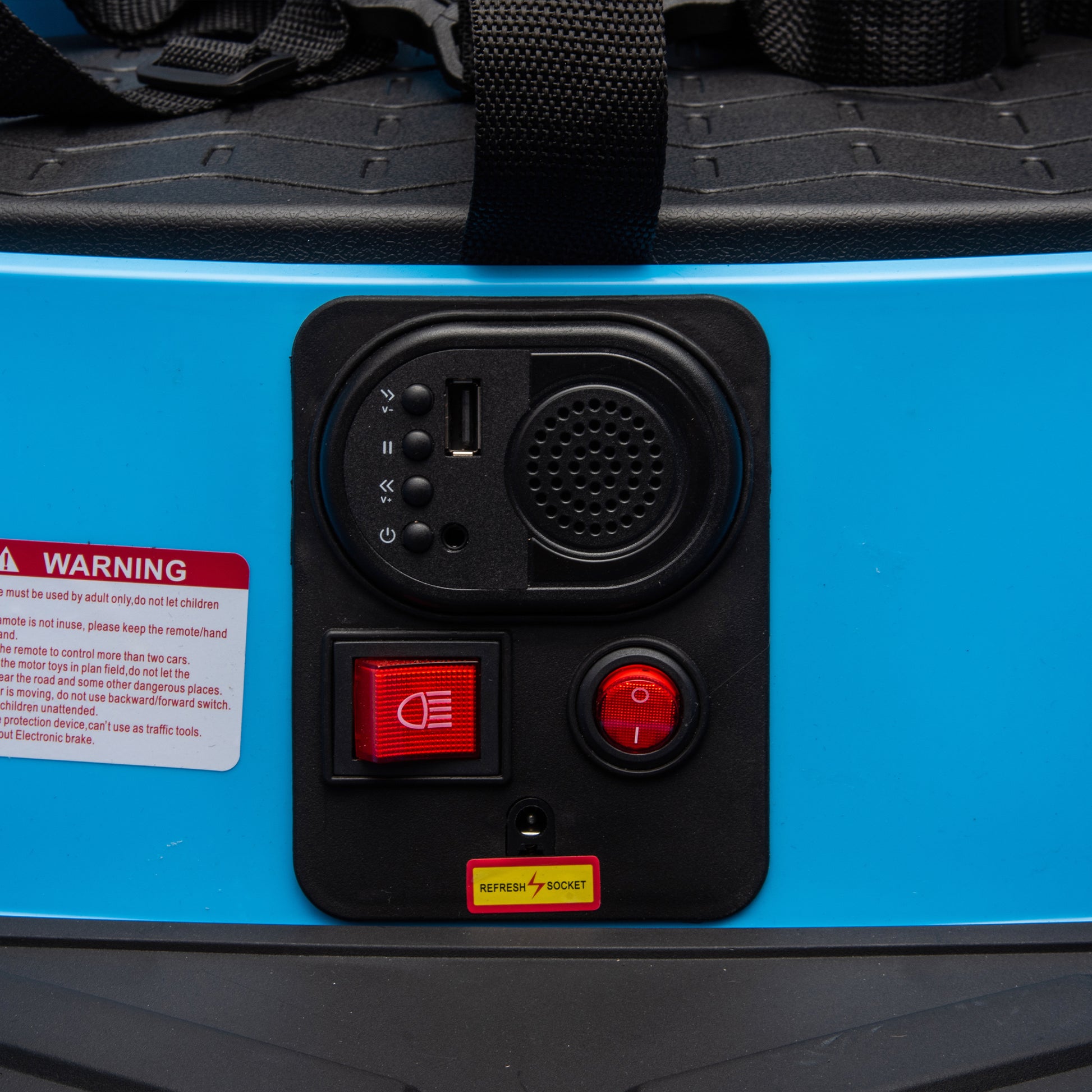 BATTERY:12v MOTOR:#390*2 Maxmum Load: 55.1 lbs Car speed: 3-5km/h Applicable age: 1.5-5 years old WORK HOUR:60MINS Test standards:ASTM,CPSIA,MSDS,CPC FUNCTION: Remote Control Light Control Switch Seven-color Flashing Lights Lights flash in sync with music Push-handle style Forward/Reverse/Reset switch Music Speaker USB MP3 Volume Adjustment Simultaneous forward, backward, and 360° left-right rotation Vehicle body with anti-collision padding Five-point Safety Belt Toolbox Swivel Wheels