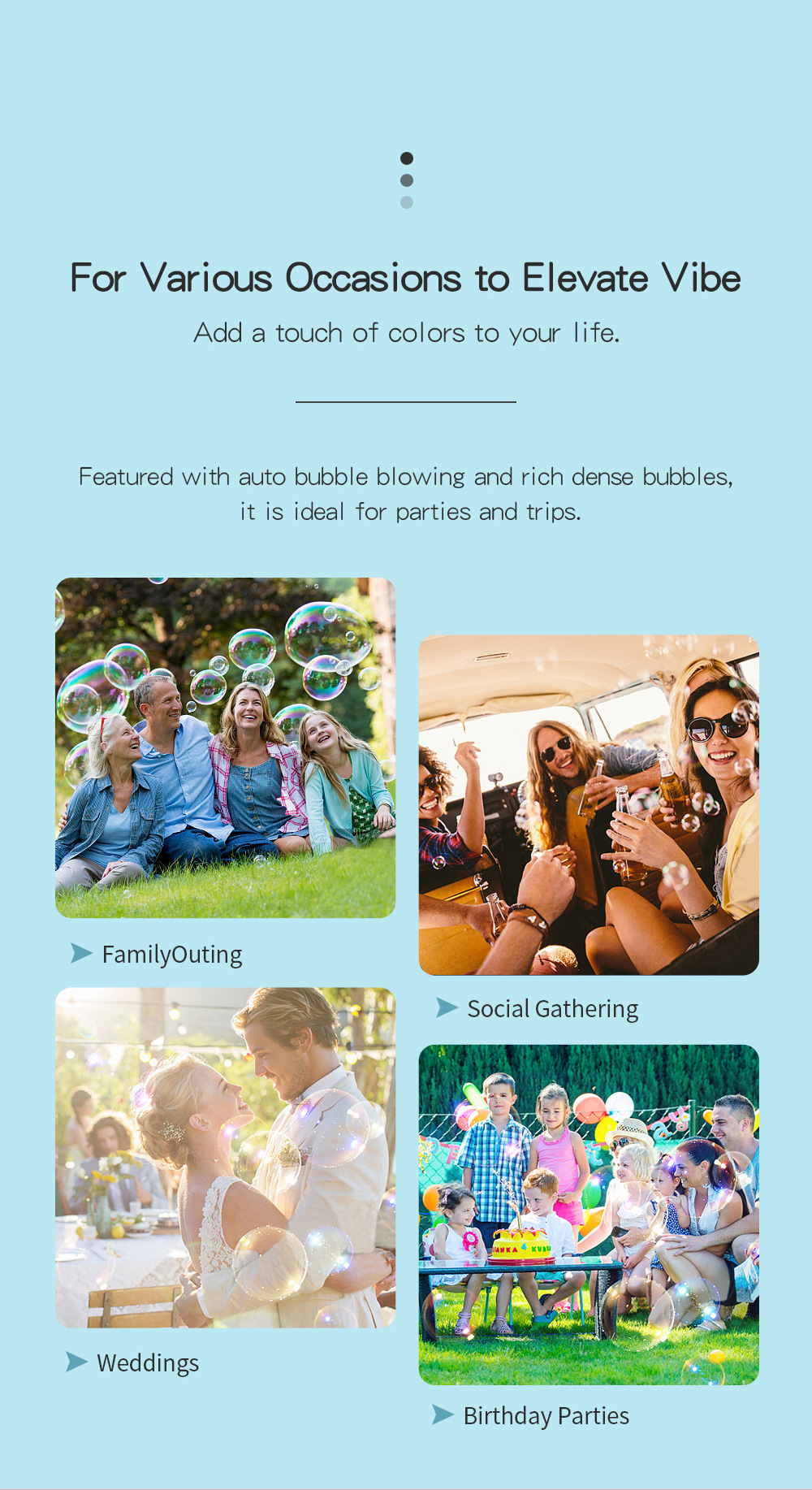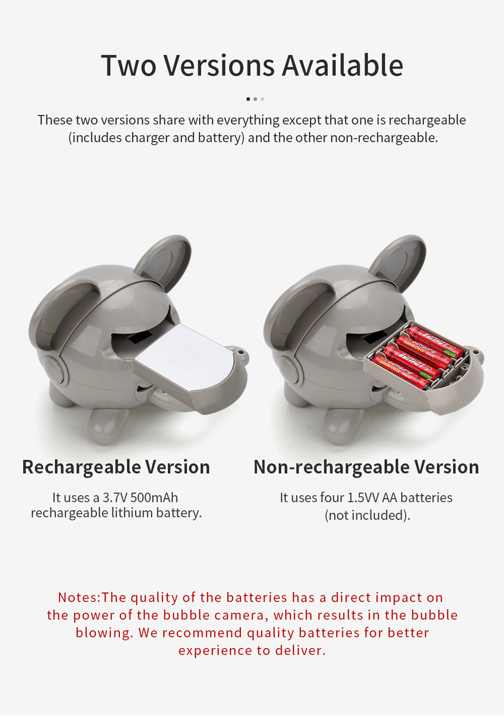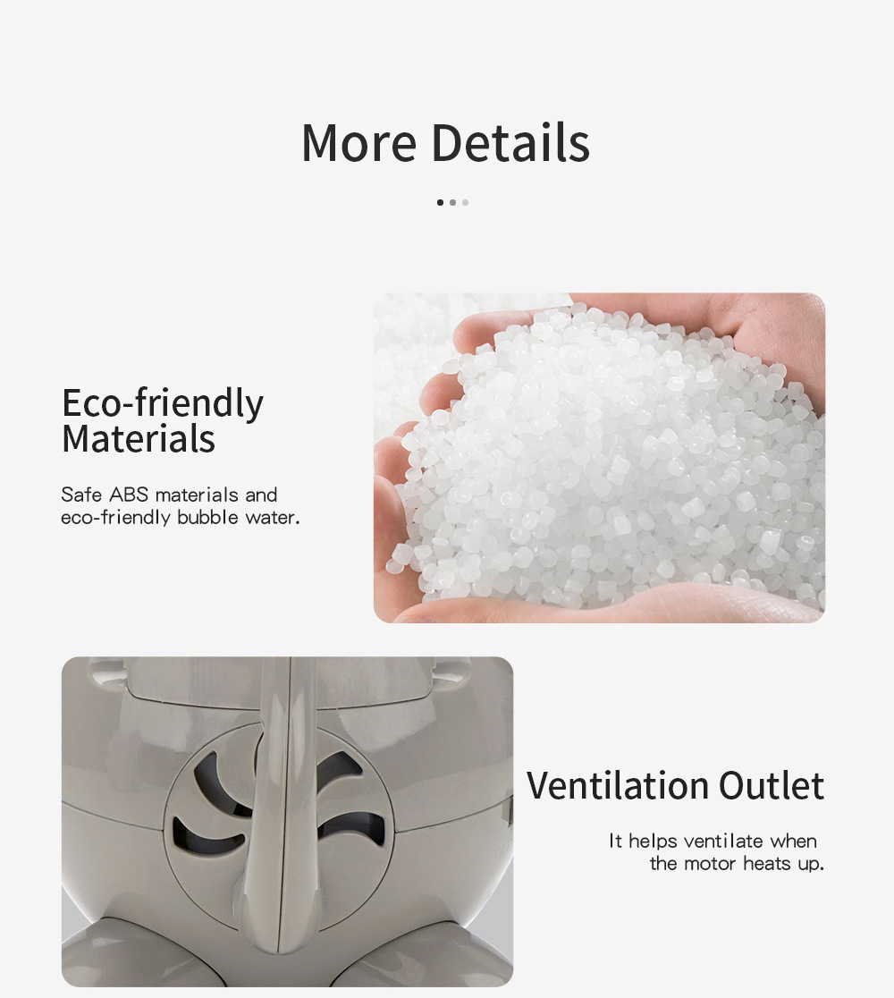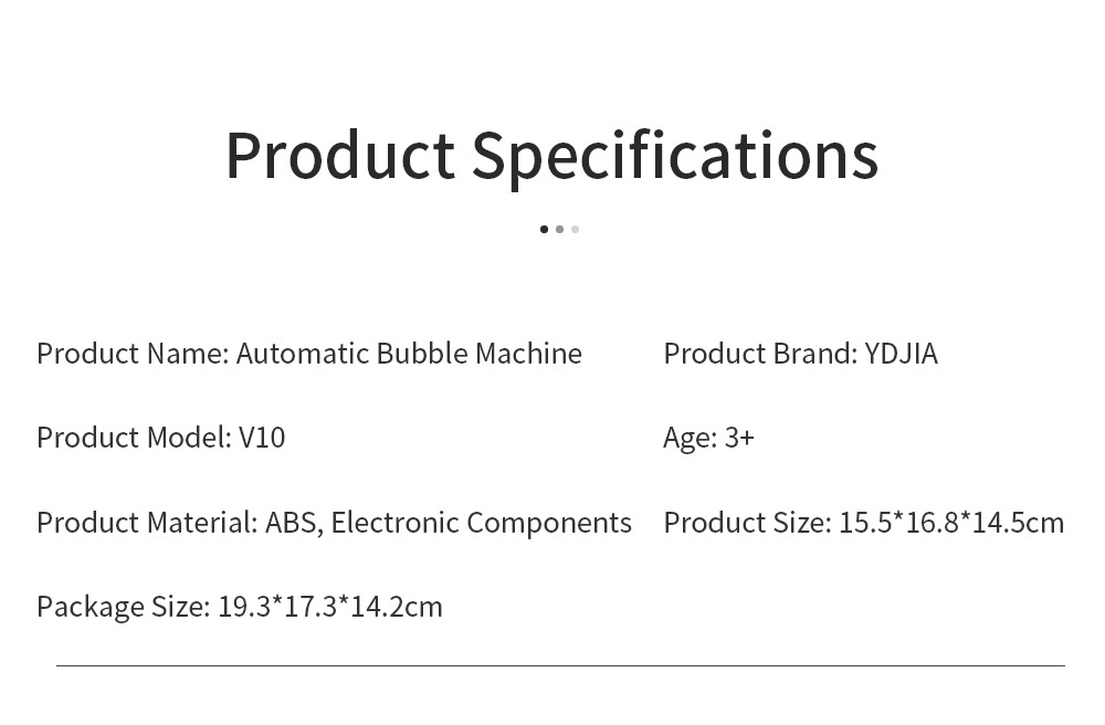 1. Simple operation: just pour in the bubble liquid (included), and start the power with one button to make bubbles.